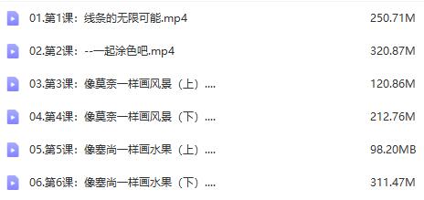 【玩转油画】零基础玩转油画棒网课文件目录:油画棒的确是最简单的作画工具(对于非色盲而言),窝这种一天美术都没学过的家伙,从零到会只花了两三天。 油画棒又是缓解一切心情抑郁、生无可恋的良方网课文件目录:00预备课:重新认识油画棒.MP401课:线条的无限可能.mp402课:一起涂色吧.mp4第3课:像莫奈一样画风景(上).mp4第4课:像莫奈一样画风景(下 ) .mp4第05课:像塞尚一样画水果(上).MP4第06课:像塞尚一样画水果(下).MP4第07课:像梵高一样画花卉(上).MP4第08课:像梵高一样画花卉(下).mp4第09课:像毕加索一样去画人物(上).MP4第10课:像毕加索一样画人物(下).mp4