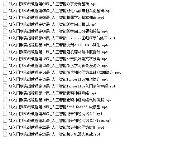 收藏 人工智能简介: 人工智能是一门基于计算机科学,生物学,心理学,神经科学,数学和哲学等学科的科学和技术。 人工智能的主要应用领域:游戏、自然语言处理 、大数据分析、视觉系统 、语音识别 、手写识别 、智能机器人等。 本AI入门到实战学习路线视频全集目录如下: 人工智能(AI)教程视频人工智能 本站所有内容均可免费下载 一、特别说明:注册会员后每天有3次免费下载各类模板、素材、课程次数,请慎用! 上一篇:JAVA数据结构与算法编程基础视频全面学习下载( 20集含源码) 下一篇:spark视频教程-spark核心知识全面学习实战教程