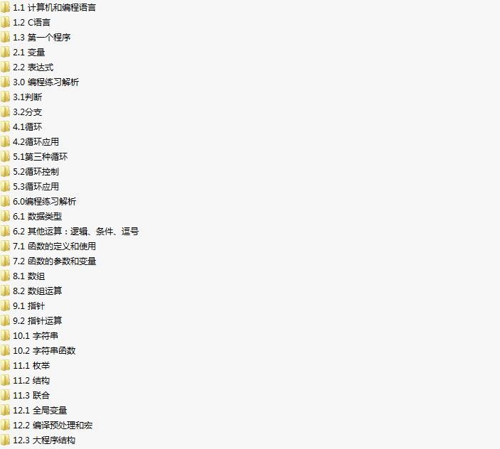 收藏 本c语言程序设计入门视频教程全集课程目录如下: 视频教程源码 本站所有内容均可免费下载 一、特别说明:注册会员后每天有3次免费下载各类模板、素材、课程次数,请慎用! 上一篇:C语言基础视频课程下载与观看(郝斌C语言全套 含视频教材+实例源码) 下一篇:C语言版档案管理系统3.0开发视频教程(宁采臣 28讲)