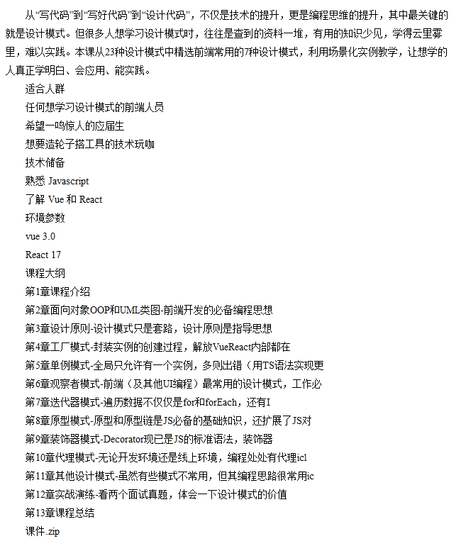本课程适合任何想学习设计模式的前端人员,包括应届生、技术玩家以及希望自己造轮子和搭建工具的开发者。课程要求学员熟悉JavaScript,并了解Vue和React等框架。 课程涵盖了面向对象编程、设计原则以及工厂模式、单例模式、观察者模式、迭代器模式、原型模式、装饰器模式和代理模式等设计模式的详细讲解。课程还提供了实战演练,让学员进一步理解设计模式的价值。 加入我们,掌握这些设计模式,将有助于您构建出高效、可维护的前端代码。课程提供课件以供学习参考。无论您是前端初学者还是有一定经验的开发者,本课程都将进一步提升您的技术水平和职业竞争力。