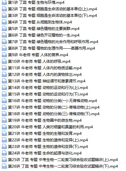 收藏 初三中考生物知识点总复习课程目录: 初中生物知识点归纳 本站所有内容均可免费下载 一、特别说明:注册会员后每天有3次免费下载各类模板、素材、课程次数,请慎用! 上一篇:初三(九年级)物理全册课本知识点归纳同步提高视频课程(全年 73讲) 下一篇:初二(八年级)物理下册课本知识点归纳同步提高视频课程(下学期 31讲)